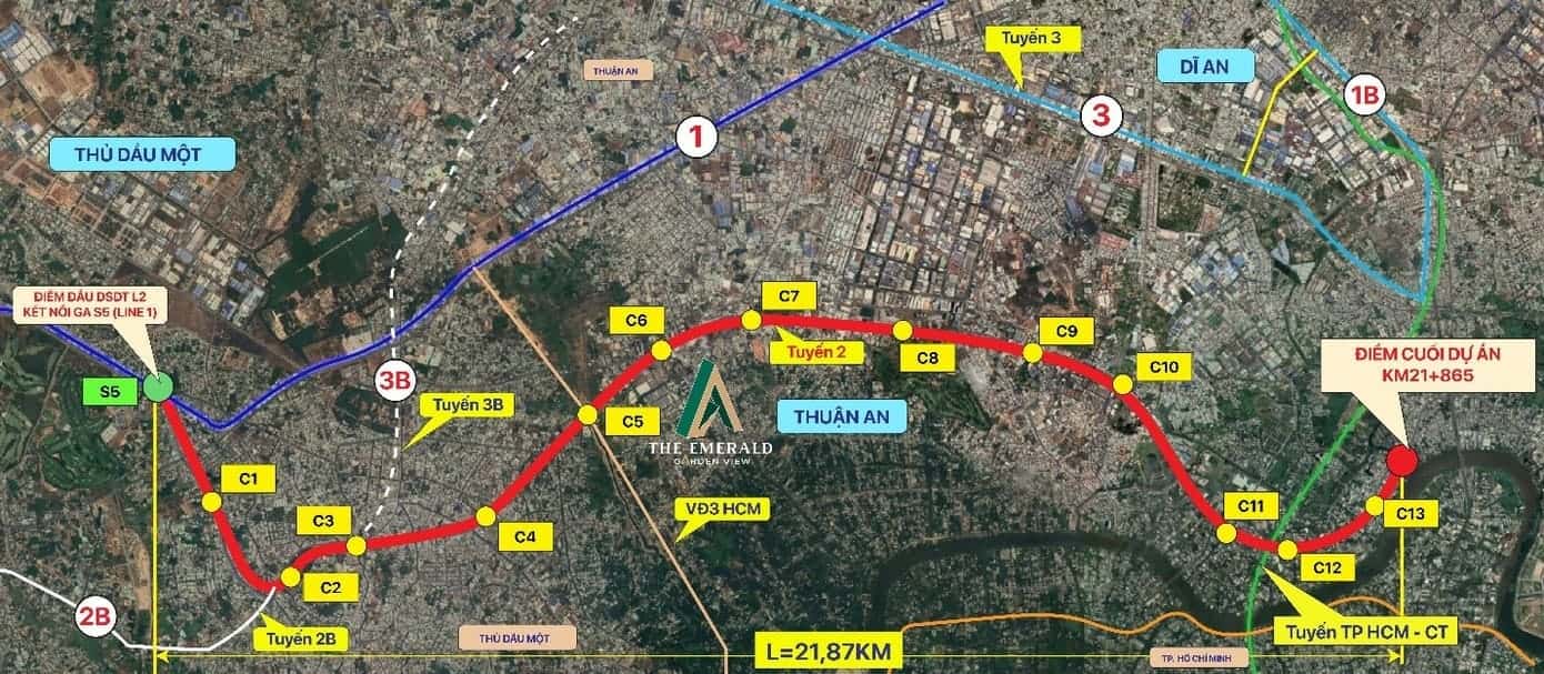 Tuyến metro số 2 (P. Thủ Dầu Một – TP.HCM) có chiều dài 21,87km, toàn bộ đi trên cao, bắt đầu từ khu vực ga S5 của tuyến đường sắt đô thị số 1, thuộc phường Phú Mỹ đi qua phường Bình Hòa và kết thúc tại phường Vĩnh Phú (TP. Thuận An cũ).